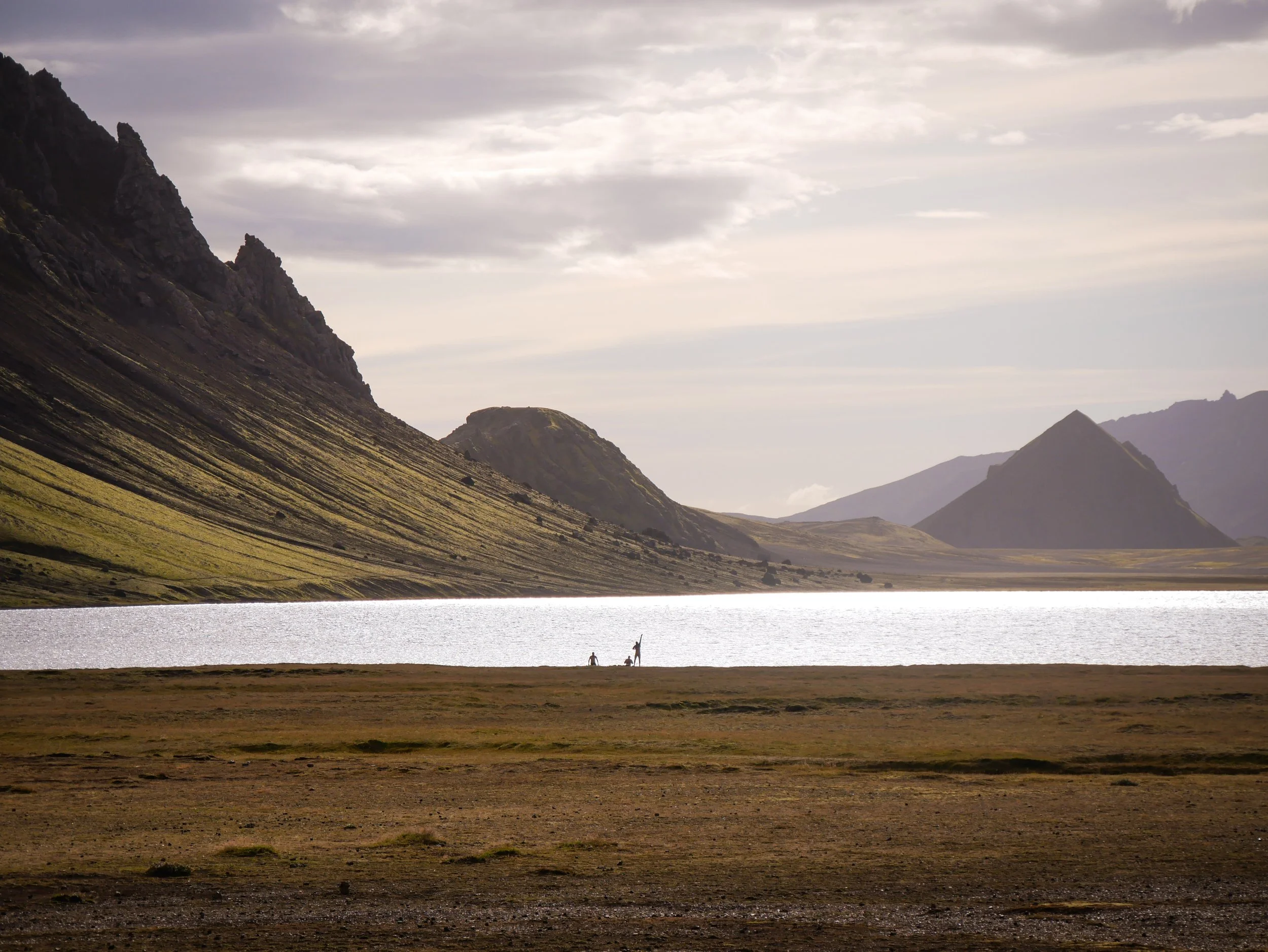Descending the heights of Jökultungur you begin to see your next destination and second hut at Álftavatn far, far off in the distance beside the lake. Checking in with the warden, I chose my sleeping pad and stretched out on my sleeping bag. The winds were really howling in this open space near the lake, but later I managed to find a sheltered spot in the sun against the lake side of the hut, to take off my boots and relax. Off in the distance, I watched as 3 of the hut guests took a cold-water plunge. After fording these glacial rivers along the trail, the lake would be too cold and exposed for my liking.