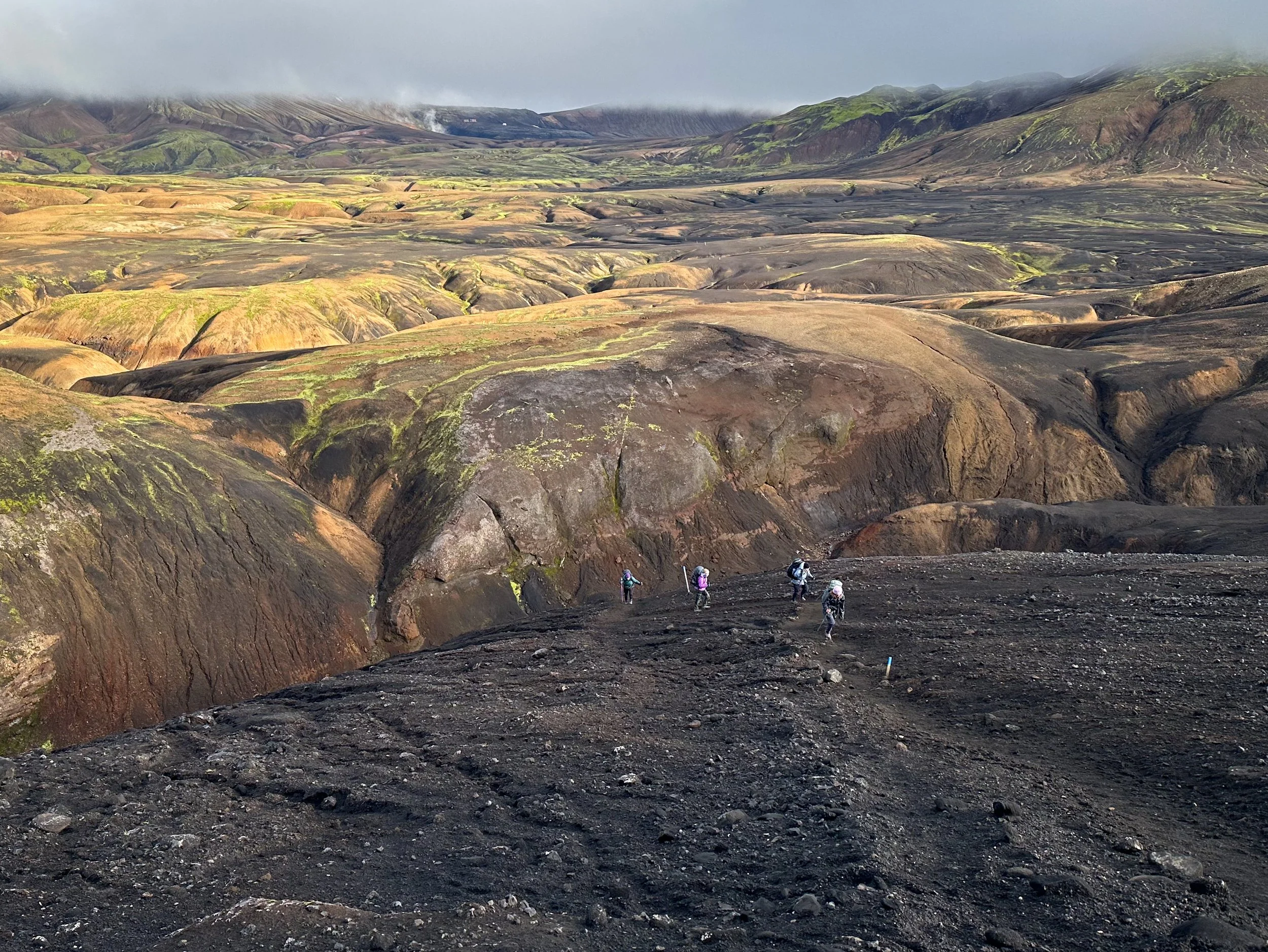 Day One of the official Laugavegur Trail finds you departing Landmannalaugar, zigzagging up through the Laugahraun lava field. Continuing past Brennisteinsalda with final views of the valley below you enter the geothermal zone of Storihver and its numerous fumaroles or steaming thermal vents. Lastly, you pass through the sparkling black obsidian fields of the Fjallabak Nature Reserve before reaching Hrafntinnusker and the first hut on this 55km trail. After all the ups and downs, this is one of the biggest days with almost 750 meters of various elevation gain. Each segment of the trail between huts is roughly 15 km.